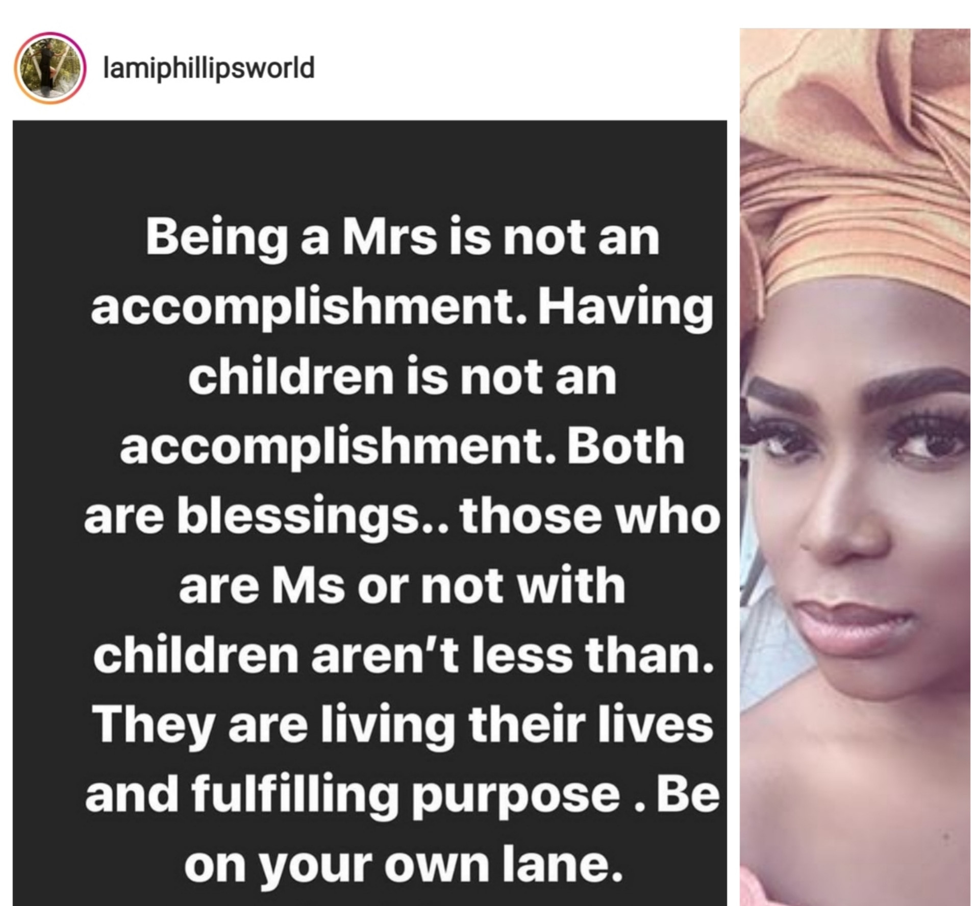 Lami Philllips who is married with a daughter, shared the caption above on her Instagram page this evening. She believes that being a Mrs or having children is not an accomplishment. Thoughts?The post Being a Mrs or having children is not an accomplishment- singer Lami Phillips appeared first on Linda Ikeji Blog.source http://www.lindaikejisblog.com/2019/12/being-a-mrs-or-having-children-is-not-an-accomplishment-singer-lami-phillips-2.html