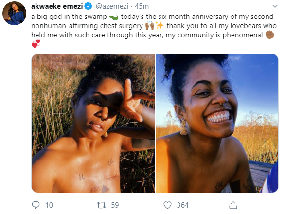 Nigerian-Tamil writer, Akwaeke Emezi, 32, shared a topless photo to show her chest after undergoing breast removal surgery. The award-winning author of Freshwater revealed she had her second surgery 6 months ago. Sharing photos of her mastectomy scars on the sixth month anniversary, she wrote:"a big god in the swamp today’s the six month anniversary of my second nonhuman-affirming chest surgery thank you to all my lovebears who held me with such care through this year, my community is phenomenal."